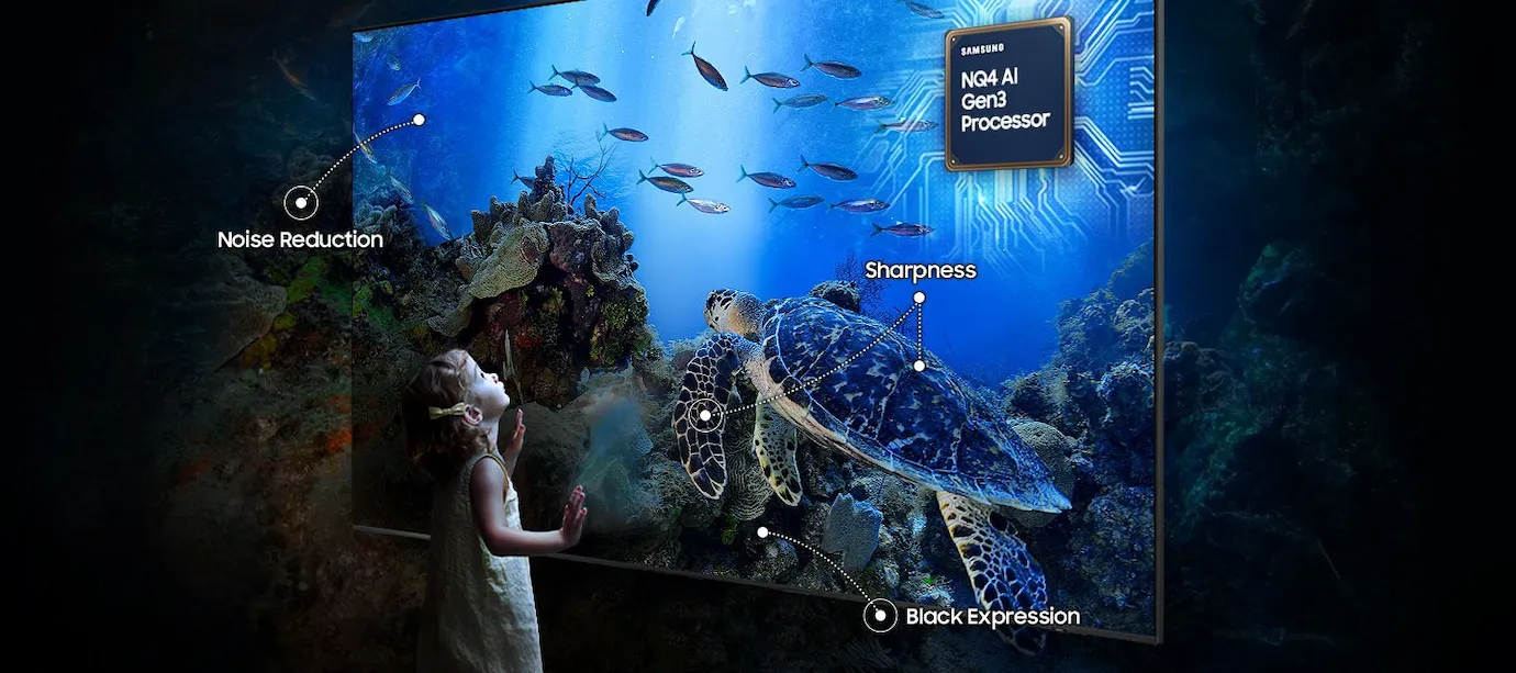 No coração da nova Neo QLED TV está o processador Neural Quantum 4K AI Gen3 com 128 redes neurais que analisam e otimizam o conteúdo de imagens e sons em tempo real. Seja streaming, jogos ou TV ao vivo – o conteúdo é escalado com precisão máxima com a ajuda do 4K AI Upscaling Pro. A tecnologia adicional Supersize Picture Enhancer garante que não haja perda de qualidade mesmo em telas muito grandes – com redução de ruído, maior nitidez e pretos intensos.