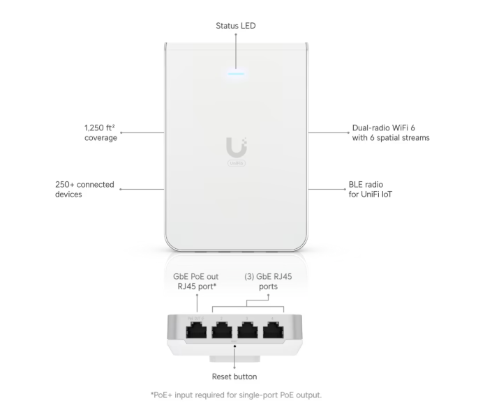 AP WiFi 6 montado na parede com 6 fluxos espaciais e um switch embutido de 4 portas, ideal para cobertura de quarto único em ambientes de hospitalidade. 2,4 GHz, 5 GHz, 4800 Mbit/s, WPA, WPA-Enterprise, WPA-PSK, WPA2, WPA3