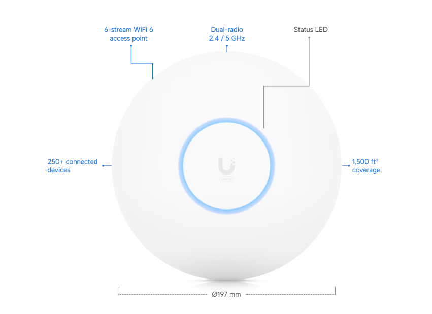 Ubiquiti U6-PRO. 2,4 GHz, 5 GHz, taxa máxima de transferência de dados: 4800 Mbit/s. Algoritmos de segurança suportados: WPA, WPA-Enterprise, WPA-PSK, WPA2, WPA3. Ethernet LAN, taxa de transferência de dados: 1000 Mbit/s. Energia por Ethernet (PoE). Cor do produto: Branco