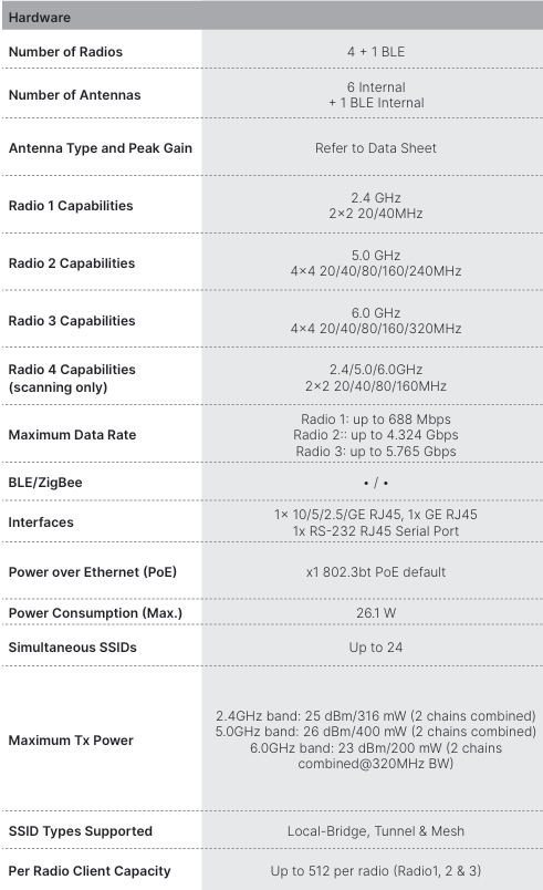 Indoor Wireless AP - (Wi-Fi-7 Tri-band 2.4/5/6GHz 2+2+2 2 streams 4 radios), internal antennas, 1x10/100/1000 RJ45 , 1x 100/1000/2500/5000/10000 Base-T RJ45, BT/BLE, 1x Type A USB, 1x RS-232 RJ45 Serial Port. Ceiling/wall mount kit included. For power order: 802.3at PoE injector GPI-130 or AC adapter SP-FAP400-PA. Region Code E
